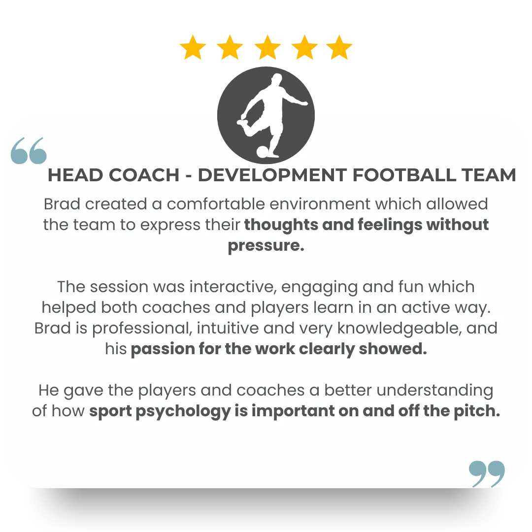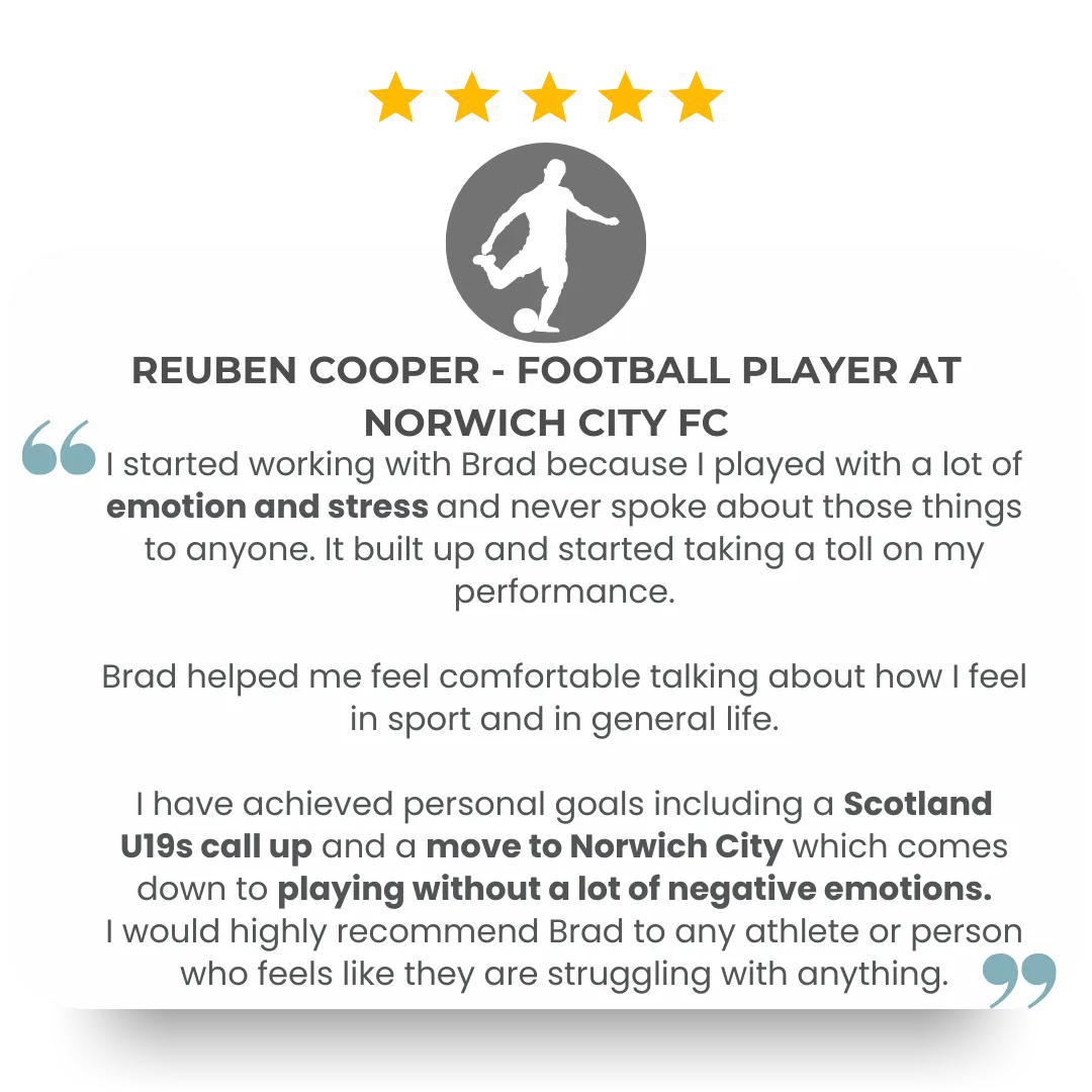 Now I feel I can manage my thoughts and feelings much better. I would highly recommend Brad to anyone looking to understand the different emotions they may feel in any sport. He’s also very approachable and takes in everything you say which is really helpful.