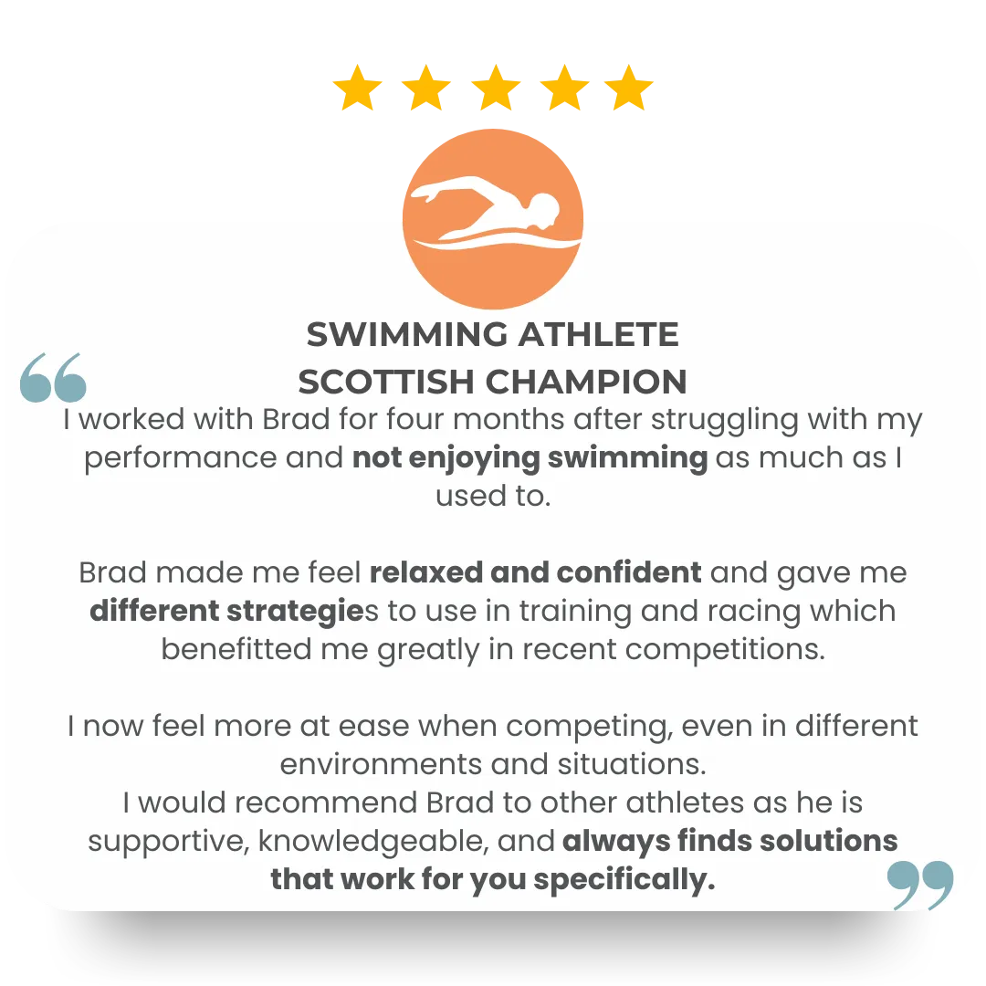 The process of working with Brad was easy. It was an extremely daunting thought to reach out for support to open up fully about my struggles with performance anxiety, which was negatively impacting my sport. Brad tailored the sessions to make them relatable to my situation and helped me navigate through the course with no judgement, only support. He helped me identify the root causes of my performance anxiety, providing coping mechanisms to deal with them and most importantly, helped me find enjoyment from the sport I love again. I cannot thank him enough for the help he gave me.
